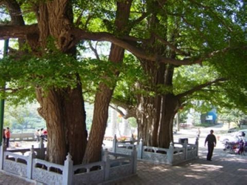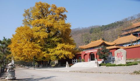 青云寺与书院之间,并立着两株银杏树,相传是孔子看望佳婿时携来的苗子,公冶长亲手植的,距今已有两千多年历史,可谓历尽兵燹、阅尽沧桑,两树比肩而立,形影不离,枝相交,根连理,如夫妻,故称同心树。树径茁壮,四人合抱尚不能围,为中华第一雌雄银杏树。